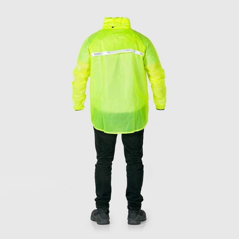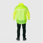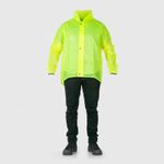 Chaqueta impermeable sellada por electro-frecuencia. Doble cierre de cremallera y broches con falsa espalda, perforaciones para ventilación y reflectivo. Más larga atrás para guarda-barros y corta adelante para que no se empoce el agua al pedalear. Cuello guarda-capota y puños con caucho. Material suave, no adquiere mal olor. Pvc siliconado calibre 8. Reforzada en la zona de las axilas. Color amarillo limón. Para uso a la intemperie. Es ideal para movilidad en bicicleta, patineta eléctrica y para uso casual.