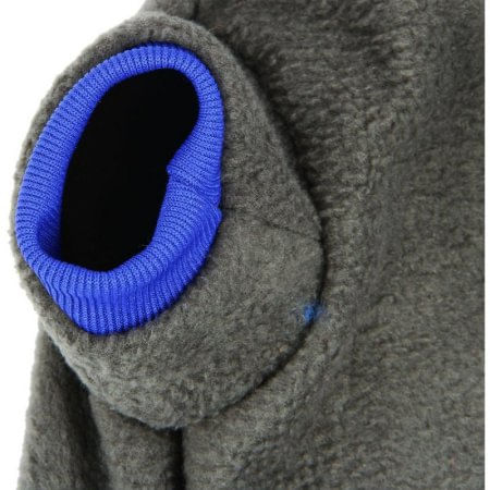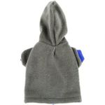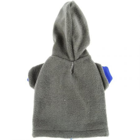 Material: fleece. Chaqueta térmica con capucha. Ideal para perros pequeños. Las mangas y el cuello son de color azul y el cuerpo y la capucha de color gris. En la parte de abajo o cierre la chaqueta tiene un cordón para ajustarla al cuerpo de la mascota.