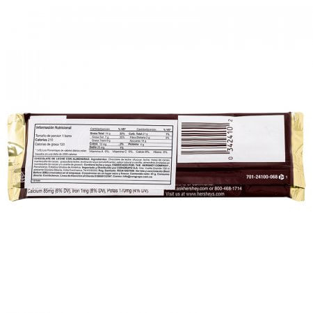 Chocolate Almendra Hershey's Las golosinas son elaboradas a base de azúcares, harinas, grasas... Por su colorido, forma y sabor, son muy atractivas y adictivas tanto para los niños como para adultos. Debido al elevado contenido en azúcar hará que tengamos más energía y por tanto menos fatiga, por lo que es ideal para los conductores, por ejemplo, así estarán más alerta, o para cuando necesitamos esa energía extra a lo largo de nuestro día. Chocolatina con almendras elaborada con chocolate de leche azúcar cacao mantequilla de cacao grasa de leche lectina de soya, sabor natural a vainilla, tiene 210 calorias por barra, contenido de 41gr, tamaño ideal para llevar a cualquier lugar, delicioso sabor, elaborada en estados Unidos. Siempre se recomienda tomarse el tiempo necesario para hacer una buena elección de los productos que comprarás y esta marca se distingue por la calidad y utilidad de sus productos, no te arrepentirás, sin duda alguna, de tu elección Material: Chocolate de leche, Azucar, Leche, Cacao, Mantequilla de cacao, Grasa de leche, Lectina de soya, Sabor natural a vainilla, Almendras, Leche de soya.. Sabor natural a vainilla. Tamaño ideal para llevar a cualquier lugar. De Primera Calidad. Medida en cm: 1 x 14 x 5. Peso: 0.1 kg.