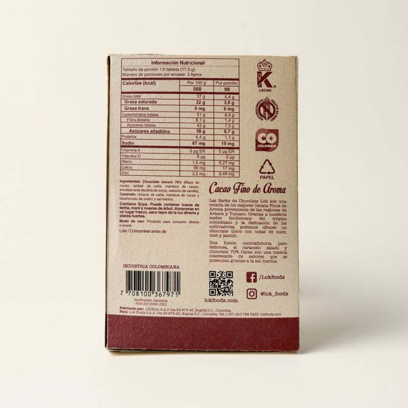 Corteza de chocolate 70% contenido de cacao con sal marina y caramelo.Caramelo salado y chocolate 70% es una contradicción deliciosa, la mezcla del caramelo y el chocolate explotarán en tu boca gracias a la sal marina.