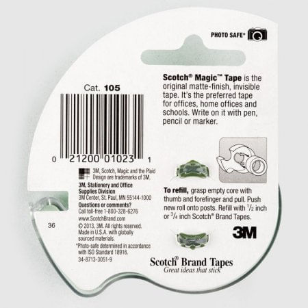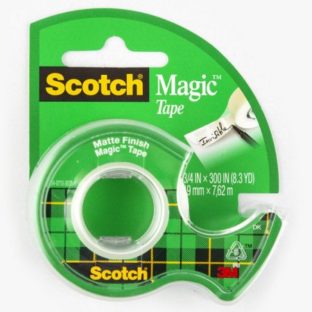 3M-Scotch Magic Tape. La cinta de acabado mate se vuelve invisible cuando se aplica a la mayoría de las superficies. Resiste la humedad, la división, el desgarro, el amarilleo y la desecación. Escriba en ella para crear etiquetas prácticas que duren o úsela para remendar envoltorios de papel, paquetes, sellar letras, mantener juntos los elementos o mostrar imágenes. Este paquete contiene un rollo de 300 pulgadas de cinta de 3/4 pulgadas.