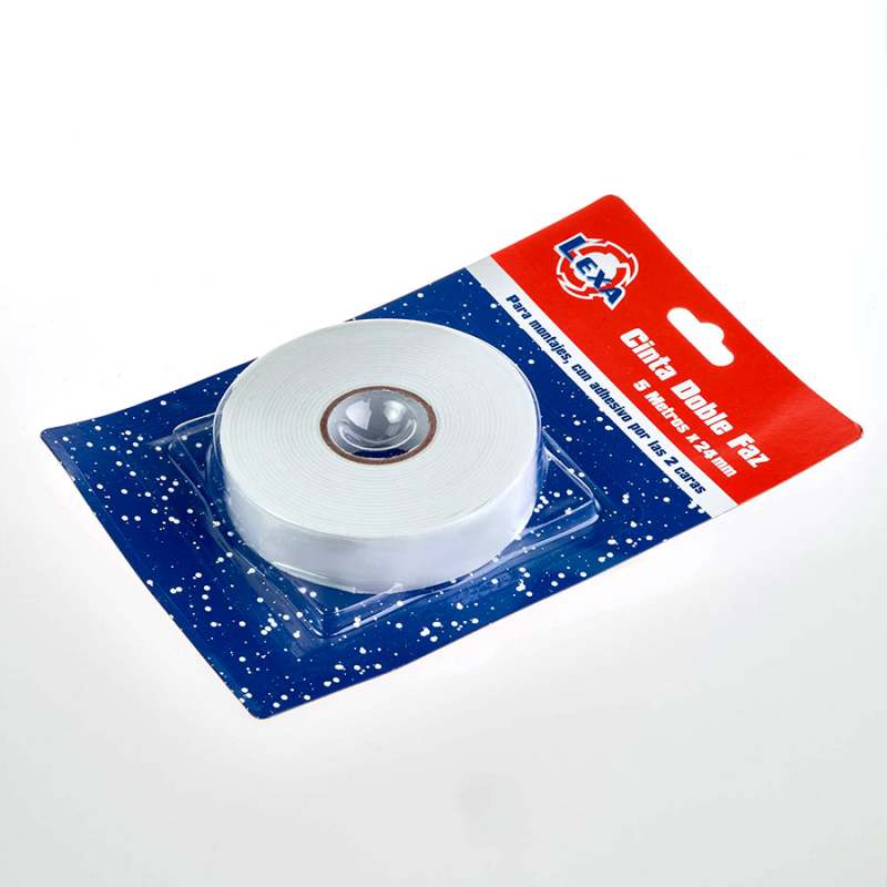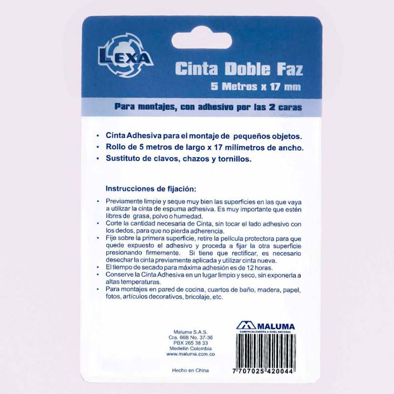 Cinta doble faz lexa de 17MM 5MT, Con adhesivo en ambos lados de la cinta, Sirve para pegar en la pared cuadros y decoraciones, Se usa en la mayoría de las superficies tales como paredes, baldosa, madera, etc, La superficie debe estar limpia, seca y lisa.