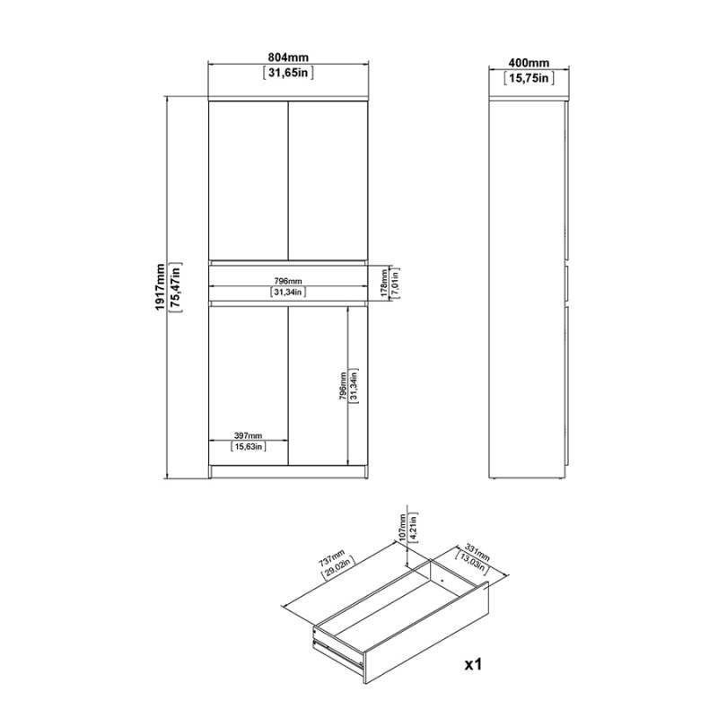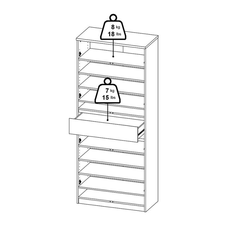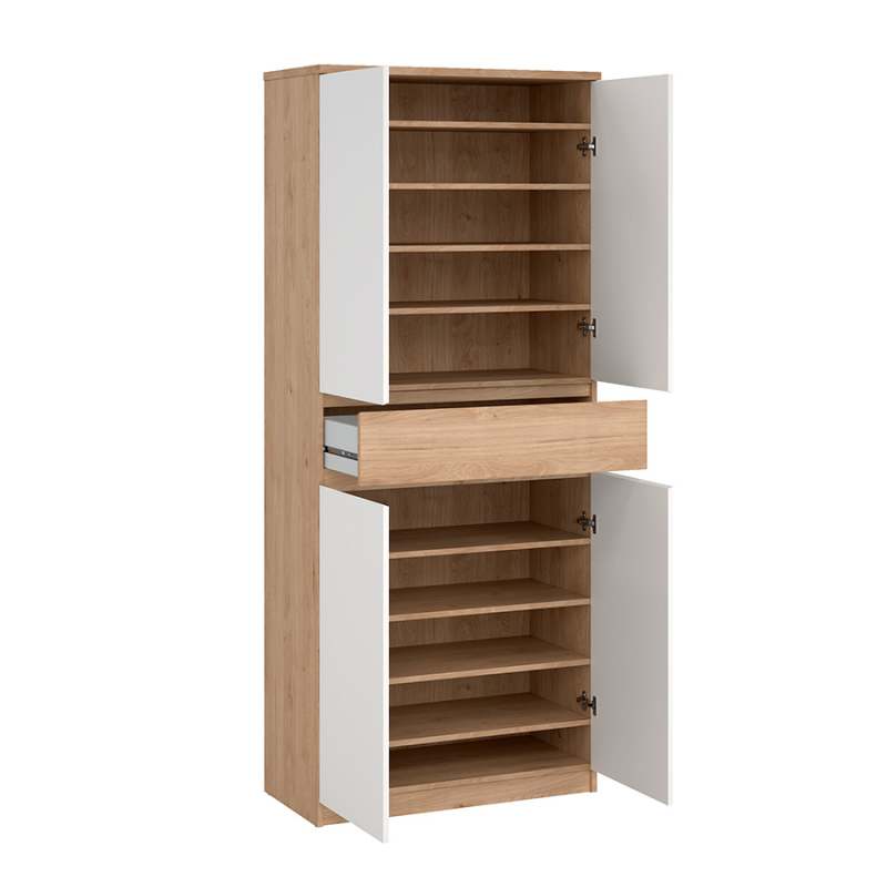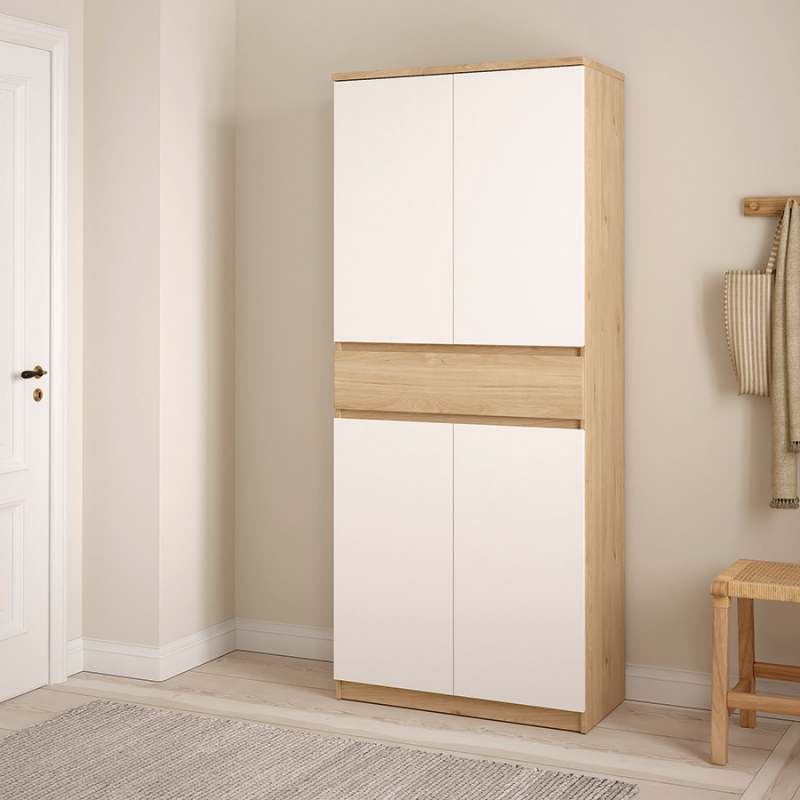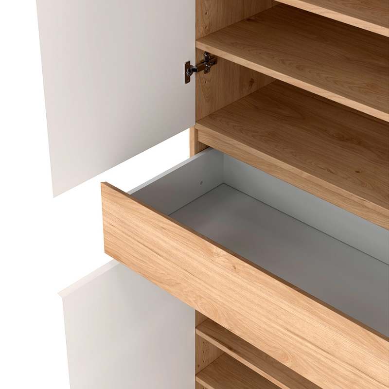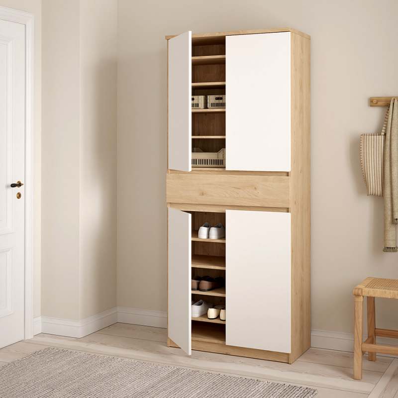 El zapatero Naia representa la elegancia minimalista y la funcionalidad. Con dos armarios cerrados de dos puertas cada uno, incluye en total ocho estantes regulables y un cajón. Tiene capacidad para albergar hasta 30 pares de zapatos. Ancho 80,4 centímetros Profundidad 40 centímetros Altura 191,7 centímetros