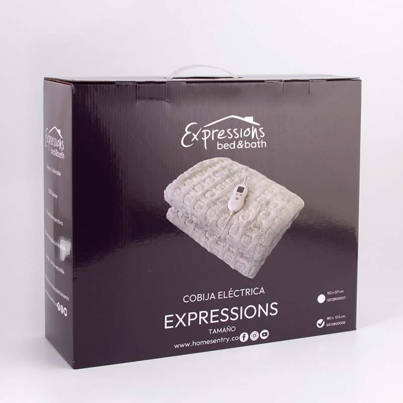 Cobija eléctrica Expressions sencillo 180x130 cm gris. Fabricada en poliéster suave y cómodo. Diseño amplio para cubrir con calidez y confort. Incluye control con ajuste fácil para regular la temperatura. Potencia adecuada para un calentamiento eficiente y seguro. Seguir los cuidados según el manual de instrucciones para un uso seguro y duradero.