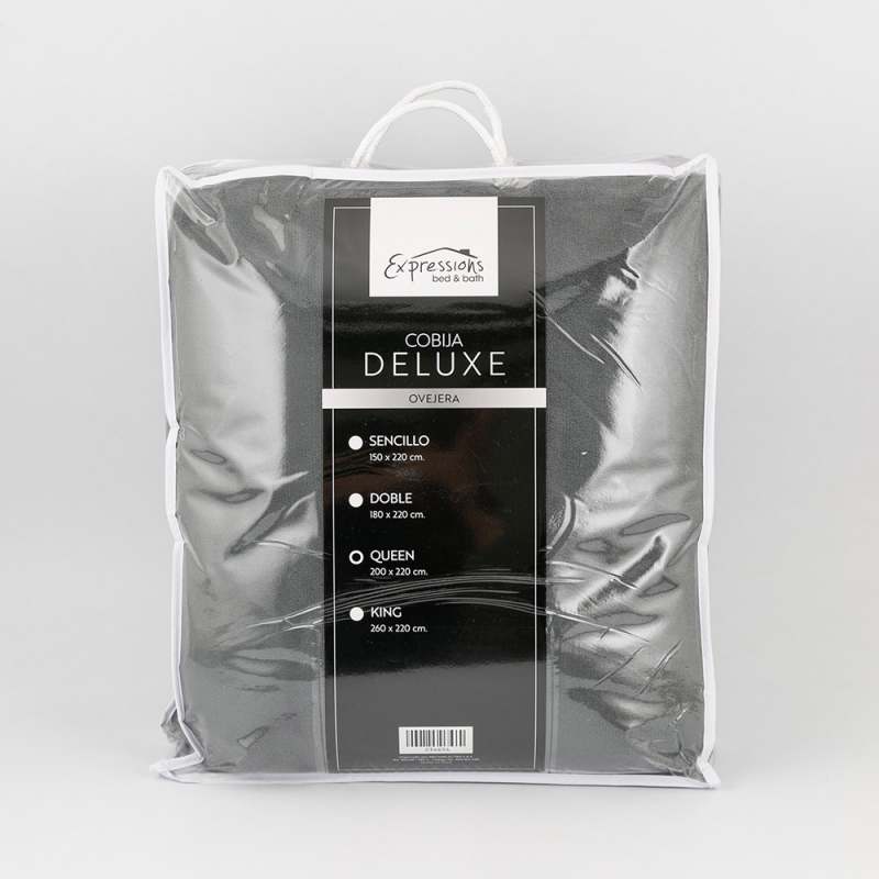 Cobija queen size 200 x 220 cm fabricada en poliéster con acabado de flannel y sherpa. Color gris sobrio y elegante. Ofrece suavidad y calidez para momentos de descanso y relax.