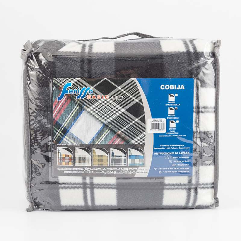 Cobija para cama doble en medida de 180x220 cm, en tela polar cuadros negro , 270 gr.