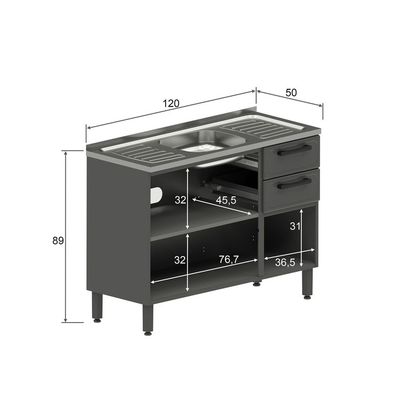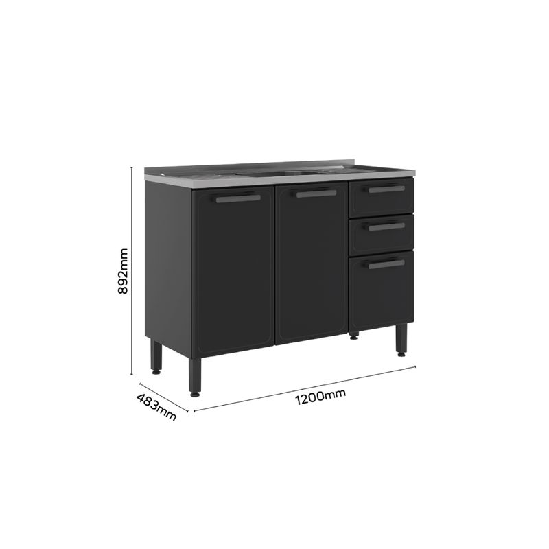 Mueble inferior Incluye lavaplatos en acero inoxidable, lado central, 3 cajones con gran espacio, rieles telescópicos con apertura total y 2 puertas.