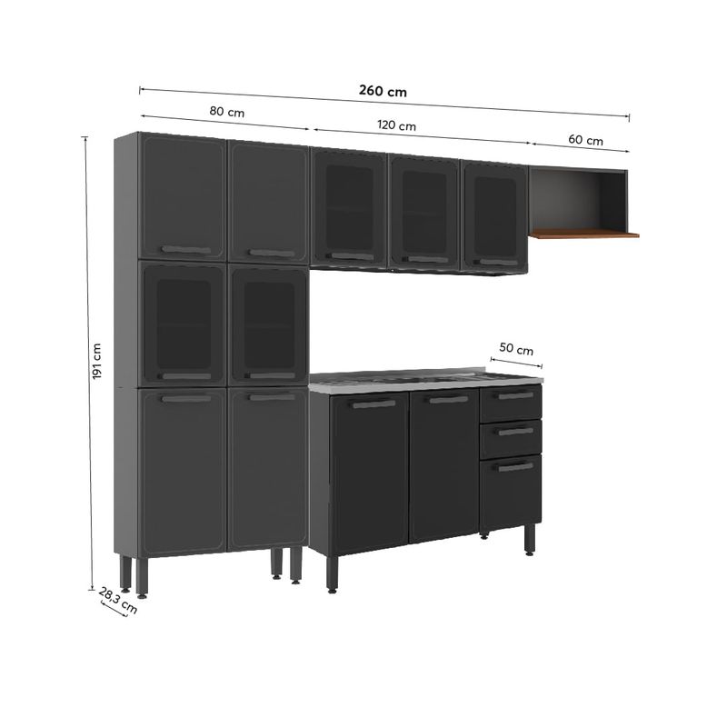 Medidas de la cocina completa: Alto: 191cm Ancho: 260cm, Profundidad: 48cm
