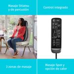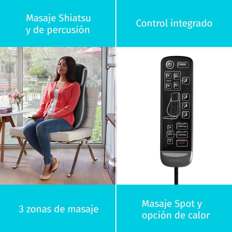 • Elige tu alivio perfecto: 2 estilos de masaje en 1 cojín. • Shiatsu de amasamiento: ofrece un relajante masaje muscular profundo. • Percusión de golpecitos: afloja los nudos apretados en la espalda y el cuello. • Toque real: el masaje de cuello y hombros cuenta con la nueva tecnología de masaje trutouch, para esa sensación de 'masajista'. • en la zona: 3 zonas de masaje de espalda o masaje puntual.