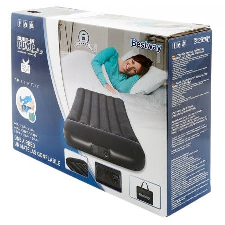 Colchón Inflable Bestway Sencillo - Negro Con un diseño ergonómico y una superficie suave y cálida, proporciona un confort excepcional. Además, cuenta con un cojín incorporado, lo que mejora la experiencia de descanso. Su material es agradable al tacto, fácil de lavar y de transportar, ya que incluye una bolsa de transporte y un parche de reparación, asegurando mayor practicidad y durabilidad.