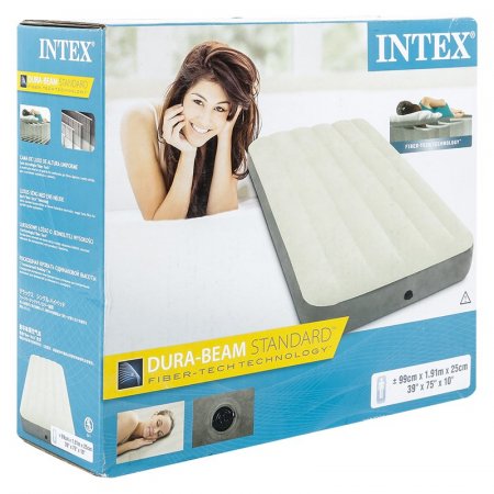 Colchón Inflable Intex Firme Elaborado en plástico y gamuza resistente, con superficies suaves y flocadas para mayor confort. Su tecnología Fiber-Tech garantiza estabilidad y firmeza, y su doble válvula de inflado permite un proceso rápido de inflado y desinflado. Color: gris y beige. Capacidad máxima: 136 kg.