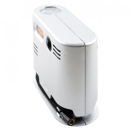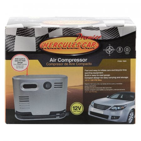 Compresor de aire elaborado en abs con impresión en plata, color gris, tension de trabajo 12V, cilindro de 19mm para máxima presión de 150 PSI, cable de alimentacion 3.2m, manguera de 72cms, fusible de 15a, incluye 3 adaptadores de inflación, ideal para el vehiculo balones y bicicletas, con medidor de aire incorporado facil de leer.