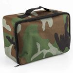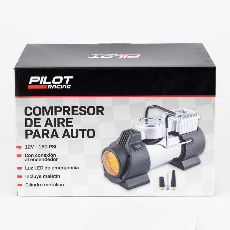 Material: Metal. Cilindro de 30mm. Flujo de aire: 40 LPM. Voltaje de entrada: 12V DC. Presión máxima: 150 PSI. Ideal para inflar neumáticos de todo tipo de vehículos, buses, bicicletas y otros. Máximo de amperios: 15A. Viene en un maletín cuadrado de lona con cierre de cremallera. Estampado en camuflado estilo militar.