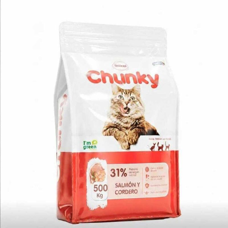 Alimento de Salmón y Cordero para Gatos Chunky-500 gr. Las mascotas son los mejores amigos y acompañantes en el hogar, se convierten en parte vital de la familia. Su compañía y forma particular de brindar amor los hace únicos y muy apreciados, es por ello que contar con los mejores productos para su cuidado es de gran importancia. Encontrar aquellos accesorios, complementos y alimentos para los más consentidos en casa es primordial, porque su bienestar, salud y buen estado de ánimo dependen en gran medida de la forma en que los alimentamos y cuidamos de ellos. La buena alimentación es el primer indicador de bienestar, por ello traemos este Alimento de Salmón y Cordero, es un concentrado elaborado a base de harina de vísceras de pollo, arroz cristal, maíz, aceite de pollo, mogolla de trigo, pasta de salmón, pasta de cordero digerido, fosfato y sal. Este alimento completo y balanceado está diseñado para gatos adultos de todas las razas, hecho con carne de verdad. Su delicioso sabor a salmón y cordero le encantará a tu mascota. Ofrece grandes beneficios ya que garantiza la ácidez de pH urinario, controla las bolas de pelo y tiene 31% de proteína de origen animal. Contenido de 500 gr. Elaborado en Colombia. Se recomienda mantener en un lugar fresco y seco lejos del alcance de los niños. Asegura un excelente plato de alimento a tu mascota. La marca está caracterizada por su calidad y versatilidad, ofrece productos que facilitan el día a día de manera práctica y con gran durabilidad. Una marca reconocida en el mercado por su grado de eficacia y altos niveles de satisfacción del consumidor. No esperes más, los productos con más altos estándares de calidad para el cuidado de tus mascotas se encuentran a tan sólo un click de distancia. Hecho con carne de verdad de salmón y cordero, control de bolas de pelo y garantiza la acidez del PH urinario. Garantiza la ácidez de pH urinario y controla las bolas de pelo Ingredientes: harina de visceras de pollo, arroz cristal, maíz, aceite de pollo, mogolla de trigo, pasta de salmón, pasta de cordero digerido, fosfato y sal, Hecho con carne de verdad. Adultos Raza Pequeña Tiene 31% de proteína de origen animal 500 gr. Invima: ICA 14508 AL Para Gatos