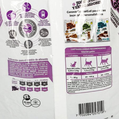 Alimento para Gato Pequeño Ohmaigat 1.5 Kilos Un miembro más de la familia Son un miembro más de nuestra familia, un integrante más de nuestro núcleo; un amigo más, una compañía de gran ánimo y de carácter incondicional. Ellas, nuestras mascotas, merecen siempre un trato distintivo y especial, y qué mejor manera de demostrarlo que dedicando el tiempo necesario para dar con los mejores insumos para cuidar de ellos, de la integridad y salud de nuestras mascotas. Concentrados y comida seca Un producto alimenticio pensado para mantener en buenas condiciones la salud de tus mascotas. Se trata de un concentrado enriquecido para gatos, elaborado con subproductos de cereales, harina de carne y hueso, harina de vísceras de pollo, harina de pescado, harina de maíz, subproductos de cervecería, pre-mezcla de vitaminas y minerales. Adicionalmente, cuenta con DHA que contribuye al desarrollo cerebral y la agudeza visual. Su contenido de M.O.S promueve la salud intestinal; por su parte, la leche contribuye al desarrollo de los huesos. Siempre la mejor elección Siempre se recomienda tomarse el tiempo necesario para hacer una buena elección de los productos que utilizaremos para mantener a nuestras mascotas, ya sea que se trate de su alimentación o su estado físico: esta marca se distingue por la calidad y rigurosidad en la elaboración de todos sus productos, No te arrepentirás, sin duda alguna, de tu elección. Para gatos pequeños. Contiene M.O.S. y DHA. Mejora la visión. Previene enfermedades del tracto urinario.