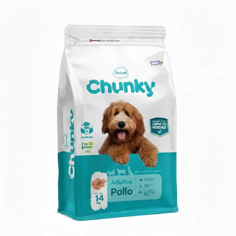 Chunky Adultos Pollo es un concentrado premium completo y balanceado, desarrollado para cubrir los requerimientos nutricionales de perros adultos de todas las razas. Su fórmula contiene proteína de alta calidad de origen animal (pollo), que promueve la salud muscular, y está enriquecida con vitaminas, minerales y ácidos grasos esenciales que fortalecen el sistema inmune, cuidan la piel y dan brillo al pelaje.