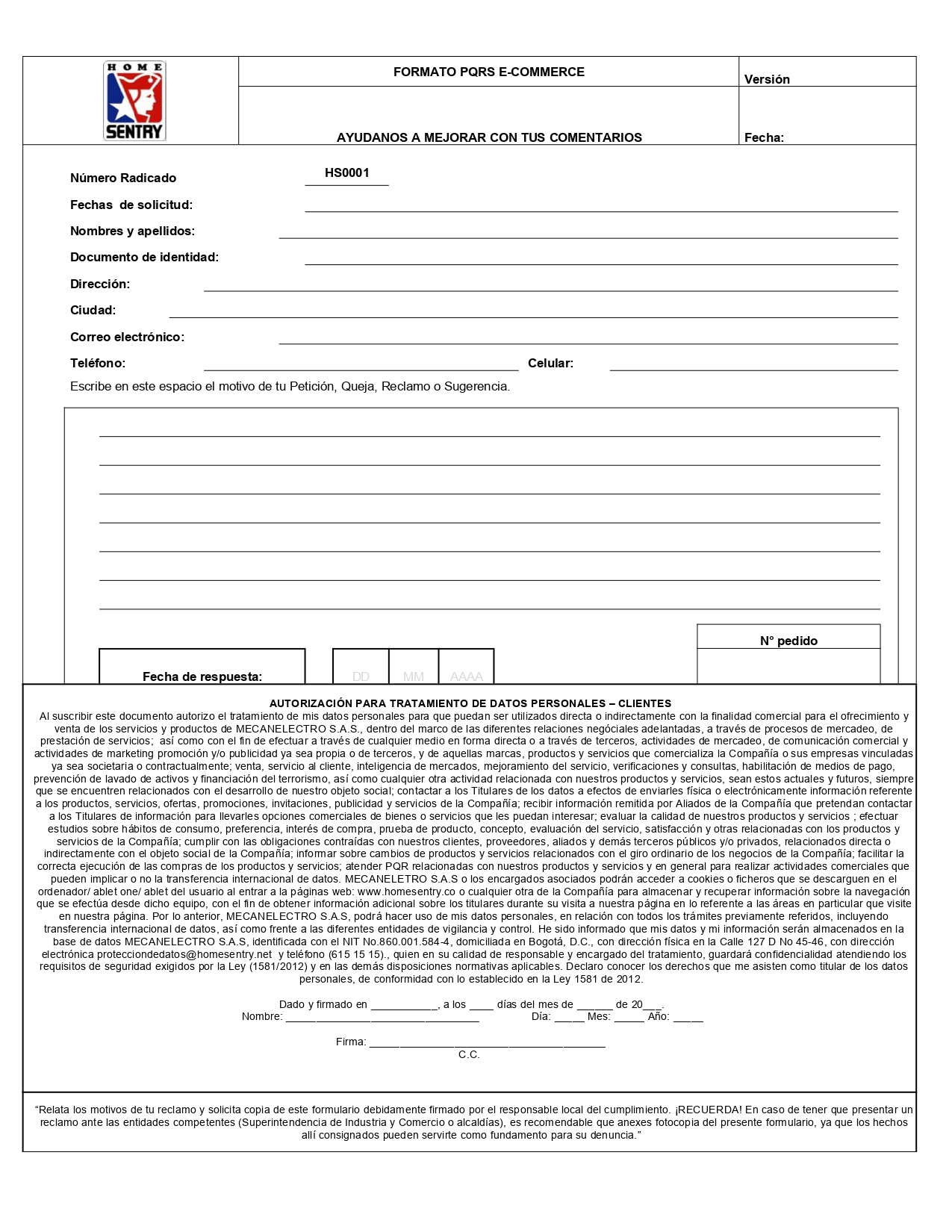 Descarga el formulario de peticiones, quejas y reclamos y envíalo al correo experiencia.cliente@homesentry.net