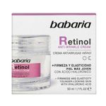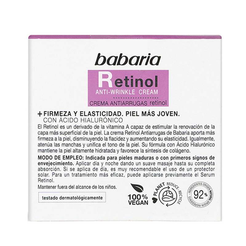 El Retinol es un derivado de la vitamina A capaz de estimular la renovación de la capa más superficial de la piel. La crema Retinol Antiarrugas de Babaria aporta más firmeza a la piel, disminuyendo la flacidez y aumentando su elasticidad. Igualmente, atenúa las manchas y unifica el tono de la piel. Su fórmula con Ácido Hialurónico mantiene la piel altamente hidratada y favorece la síntesis de colágeno Uitlizar unicamente en la noche