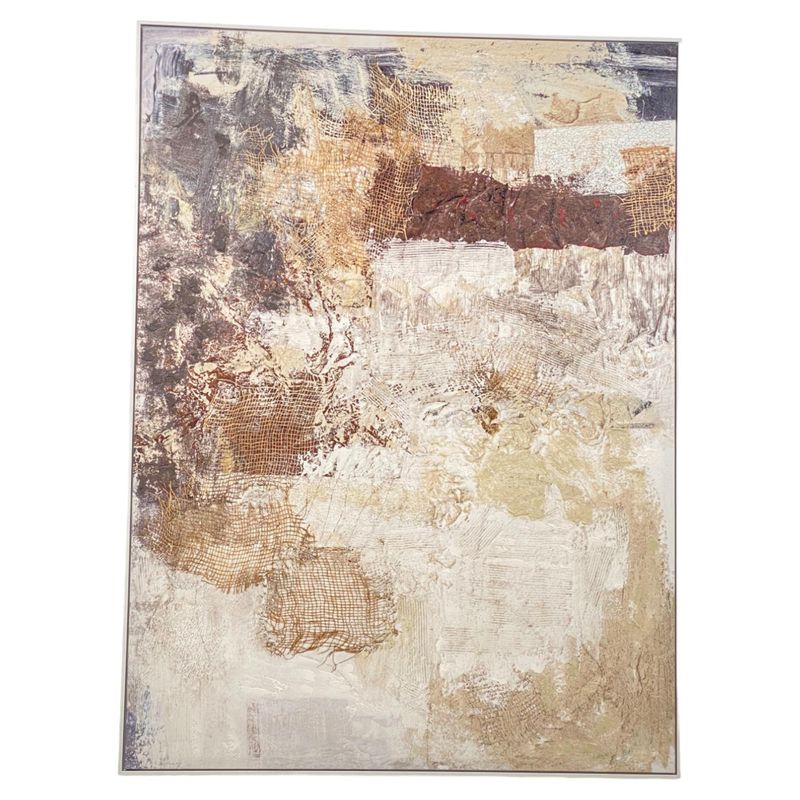 Cuadro Arena con composición abstracta en tonos neutros y tierra, medidas 112x152 cm, pieza de gran formato que aporta profundidad visual y carácter contemporáneo a salas, comedores o espacios amplios.