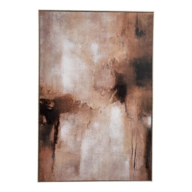Cuadro Bruma en madera con composición abstracta en tonos tierra y contrastes profundos, medidas 82x122 cm, pieza artística que aporta atmósfera y carácter a salas, comedores o espacios contemporáneos.