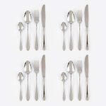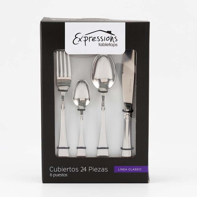 Material: Acero inoxidable. Set de cubiertos de 24 piezas. Incluye: 6 cuchillos, 6 tenedores, 6 cucharas, y 6 cucharitas. Diseño elegante.