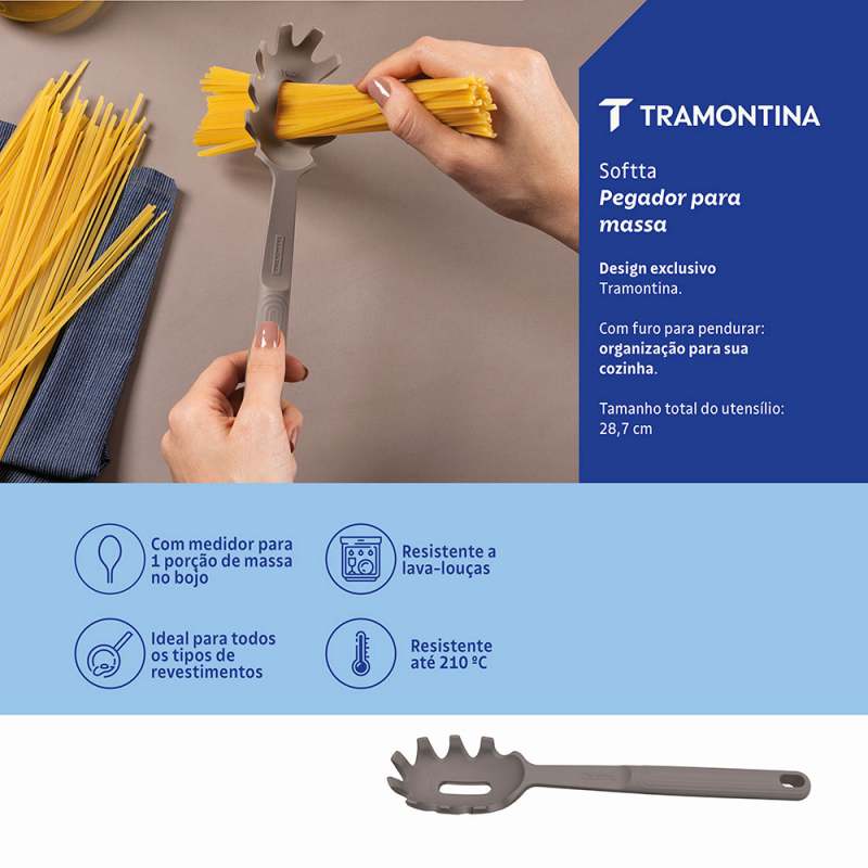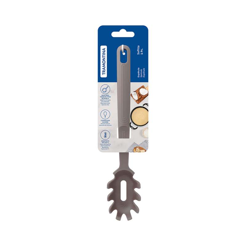 Cucharon para pasta de silicona, resistente a temperaturas de hasta 210 °C. Cuenta con un orificio en el mango para colgarla en la cocina. Ideal para usar en sartenes con revestimientos antiadherentes y cerámicos, ya que no los daña. Utensilio de silicona de alta calidad, ideal y seguro para uso alimentario, que cumple con las normativas ANVISA y FDA. Apta para lavavajillas, para que te resulte más fácil la vida.