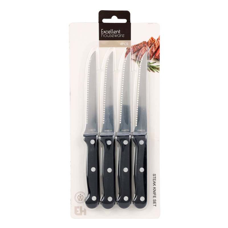 Cuchillos Setx4 Pcs. En Metal, Grosor hojas: 1.2 mm. ( en color Plateado), con cierras. Mango Color Negro en Polipropileno: contine 3 clavos, color plateado). Ideales para realizar cortes a carne, filetes y otros platos a la parrilla que se requieran rebanar. Gracias a sus afiladas hojas dentadas de acero inoxidable, los cuchillos se mantienen afilados durante mucho tiempo y cortan sin esfuerzo una gran variedad de carnes. Los mangos ergonómicos garantizan un agarre cómodo y un control óptimo al cortar.