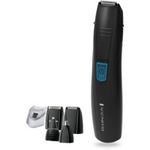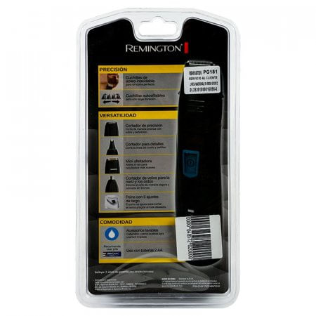 Detalladora. Marca: Remington. Color: negro y azul. Material: pasta y acero inoxidable. Las cuchillas son autofilables y la cortadora funciona con dos baterías AA. Su diseño portátil ideal para llevar a cualquier lugar. Recorta, detalla y resura. Este incluye cabezal cortador de precisión, mini afeitadora, recortadora de 5 posiciones, cortadora para detalles y cortador para vellos de nariz y oídos. Resistente y con un diseño moderno. Es de fácil uso y sus accesorios son lavables para fácil limpieza.