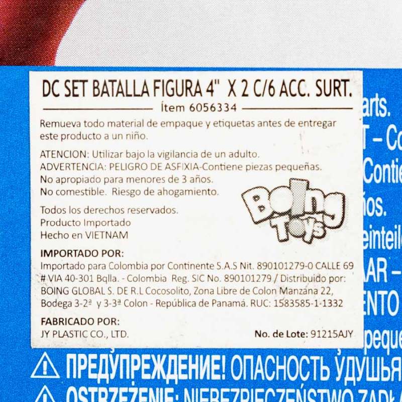 Set de batalla de figuras DC con accesorios - Puede variar el modelo, color y diseño enviado - Edad recomendada 3 años en adelante - PRODUCTO SURTIDO SE VENDE POR SEPARADO Los productos marcados como 'PRODUCTO SURTIDO' pueden no ser idénticos a los que aparecen publicados en las imágenes. Las imágenes son ilustrativas. Al comprar un producto identificado como producto surtido, aceptas que podrás recibir un producto con características y atributos tangibles diferentes a los que aparecen en las imágenes del sitio o la publicidad. Los productos surtidos mantendrán las propiedades físicas, químicas y técnicas necesarias para su funcionamiento y uso de acuerdo a su naturaleza.