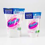 Gama de quitamanchas Vanish: formatos combinados (900+450 ml, 1800+800 ml) con fórmulas destinadas a eliminar manchas difíciles en prendas.