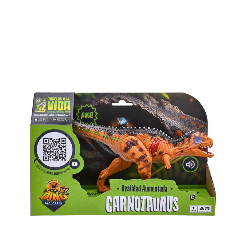 La Figura Dino Realidad Aumentada Carnotauro es una impresionante adición para cualquier entusiasta de los dinosaurios. Fabricada con materiales rígidos y extremidades articuladas, esta figura no solo es robusta sino también muy interactiva. Entre sus características destacadas se encuentra la tarjeta de realidad aumentada incluida en cada empaque, la cual permite una experiencia inmersiva a través de la APP. Además, si coleccionas más tarjetas, podrás simular combates entre dinosaurios. Los sonidos realistas de rugidos y la necesidad de 3 pilas LR44/1.5V aseguran horas de diversión. Este Carnotauro es uno de los 7 modelos coleccionables disponibles