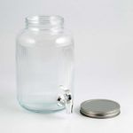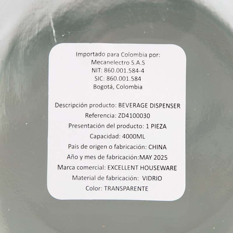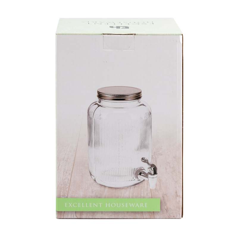 Dispensador Excellhouse zd4100030 de 4 lt en vidrio. Cuenta con cuerpo transparente con textura vertical, tapa metálica roscada en color plateado y llave dispensadora frontal en acabado metálico. Ideal para servir bebidas frías en reuniones y espacios del hogar.