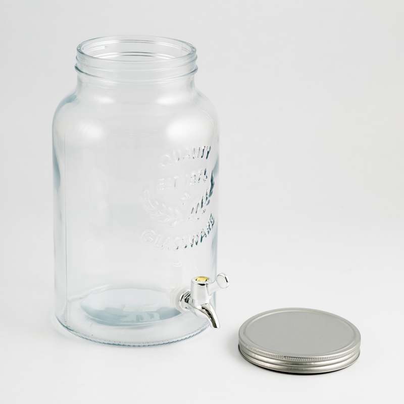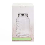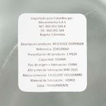 Dispensador de vidrio con capacidad de 5.5 litros, elaborado en vidrio transparente con diseño grabado en el frente. Incluye tapa de metal en color plateado y llave dispensadora en acabado cromado para un fácil servido. Ideal para bebidas frías en reuniones o uso doméstico.