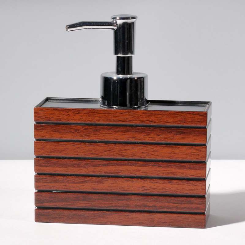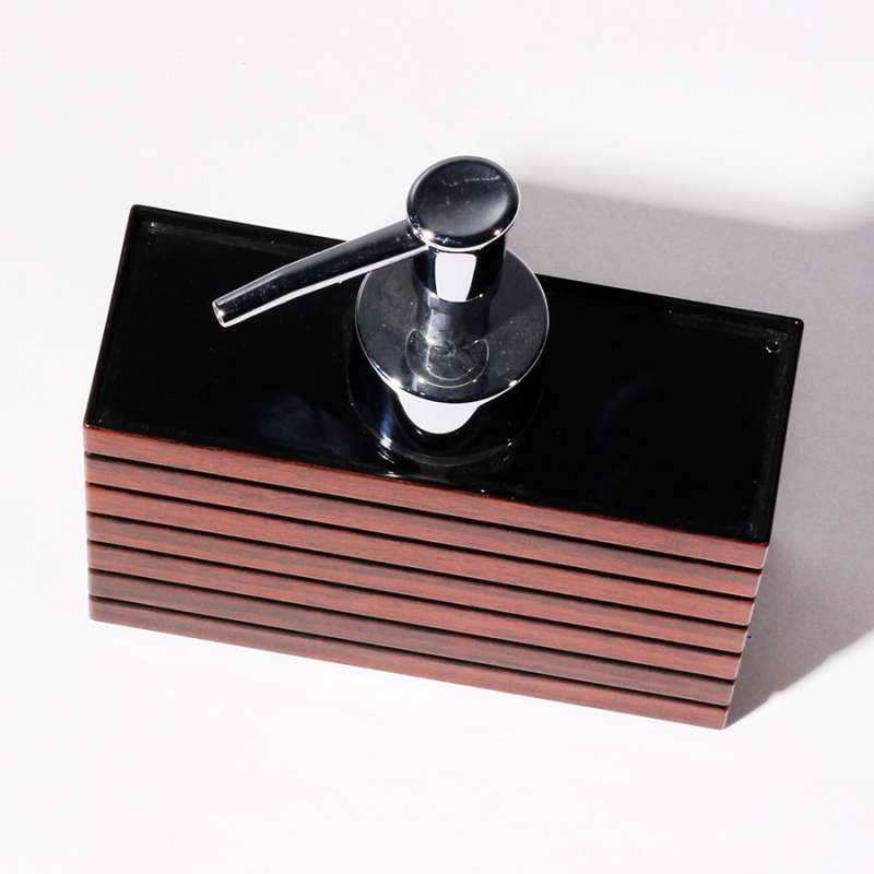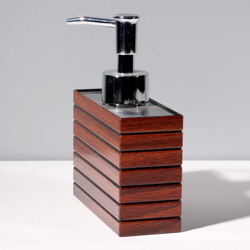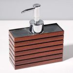 Dispensador de jabon liquido en plastico, color café, diseño rectangular, bastante elegante, tiene la facilidad de adaptase a cualquier tipo de decoracion