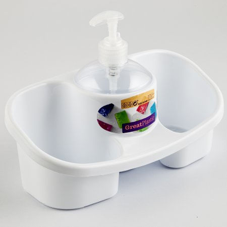 Dispensador De Jabon De Loza Marca Great Plastic Con Soportes Para Esponjas Color Blanco