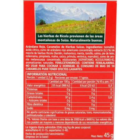 Ingredientes: Hierbas suizas. Arándanos. Aromatizante. Eedulcolorantes. Caja que contiene caramelos. Sin azúcar. Naturalmente refrescantes. Contenido neto: 45 gramos. Hierbas de Ricola proviene de las áreas montañosas de Suiza. Naturalmente buenas.