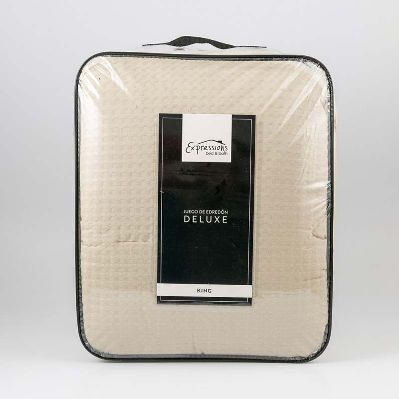 Edredón Expressions King 200x200 cm en color beige, fabricado en poliéster de alta calidad. Este edredón ofrece calidez y confort ideal para noches frescas, con un diseño moderno que aporta elegancia y estilo al dormitorio. Su tamaño doble es perfecto para camas medianas y es fácil de cuidar y mantener, brindando un descanso agradable y duradero.