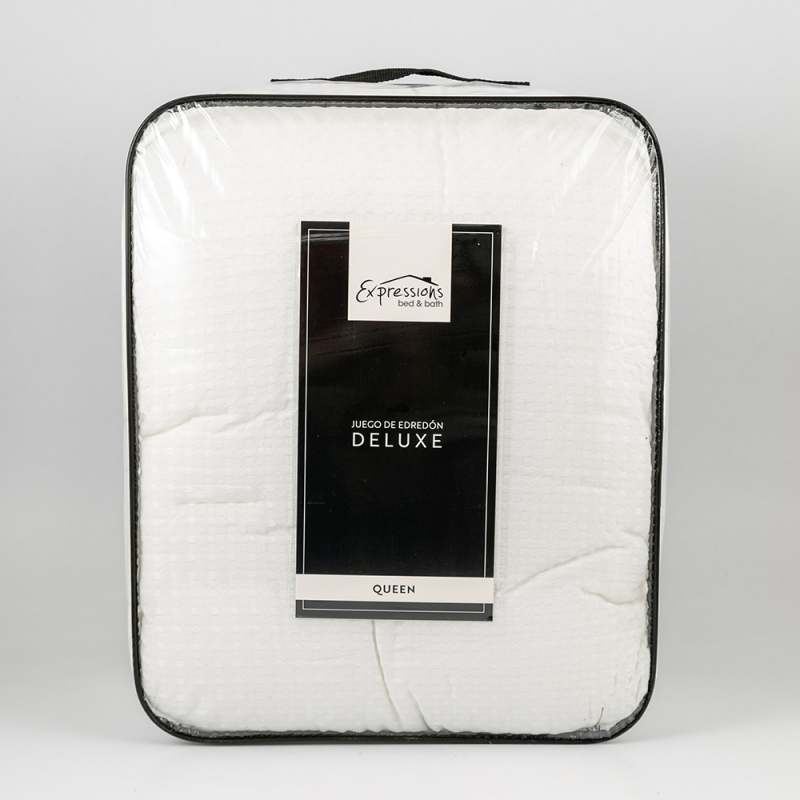 Edredón Expressions Queen 190x160 cm en color blanco, fabricado en poliéster de alta calidad. Ofrece calidez y confort ideales para noches frescas, con un diseño elegante que aporta estilo moderno a cualquier dormitorio. Su tamaño queen es perfecto para camas grandes y es fácil de cuidar y mantener.