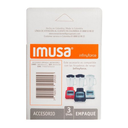 El empaque de caucho para licuadora contiene 3 unidades. El accesorio es compatible con las licuadoras de rango Infiny Force de IMUSA. Cuenta con una garantía de 3 meses, por defecto de calidad.