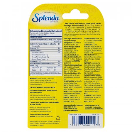 Endulzante Splenda Contiene 40% de sucralosa, edulcorante no calórico. Cada tableta contiene 6 mg de sucralosa. 1 tableta equivale a 1 cucharadita de azúcar. Presentación de 100 tabletas. Consistencia tipo paté. Peso neto de 130 g. Mantener en lugar seco y fresco. registro invima RSIA 22I01101.