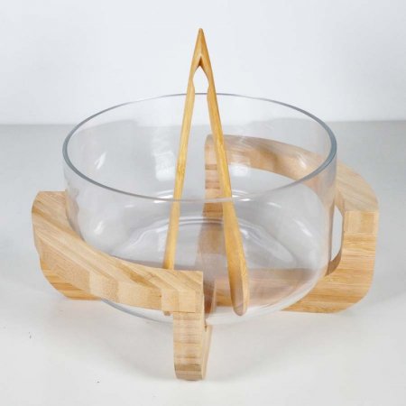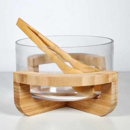 Ensaladera hecha de vidrio fuerte, brillante y resistente a golpes . Ideal para ensaladas, snacks o frutas. Incluye Base y pinzas en bambu. Capacidad 3850 ml