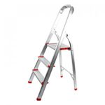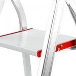 Escalera de tres pasos elaborada en aluminio de color plateado con contraste brillante, tiene en la parte superior de los escalones textura rugosa para evitar deslizamientos, patas y uniones elaboradas en pasta color rojo, tiene agarradera superior para mejor transporte, es plegable, de fácil limpieza y almacenamiento, idónea para todo tipo de espacio, practica, resistente.