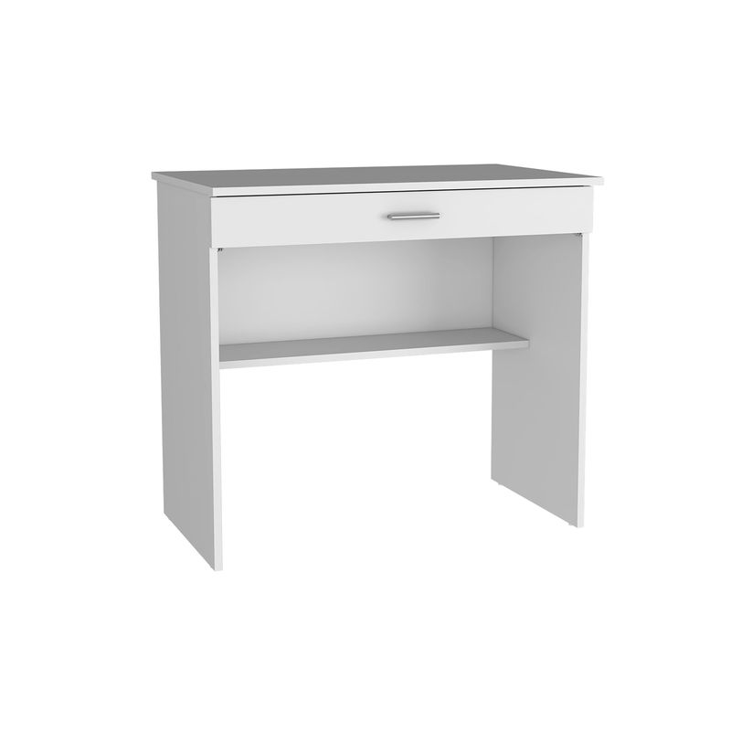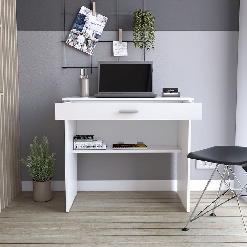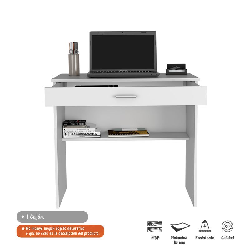 Escritorio con entrepaño y gaveta con espacio para guardar objetos utiles
