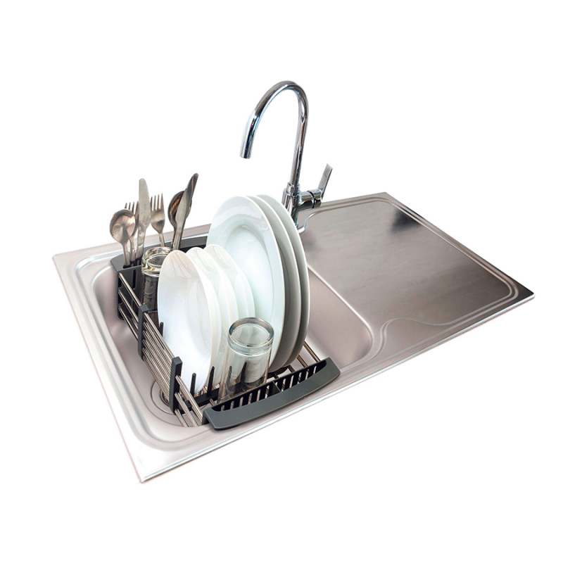Estante expandible. Se adapta eficientemente al tamaño del espacio de su fregadero. Se compacta para almacenamiento más eficiente.
