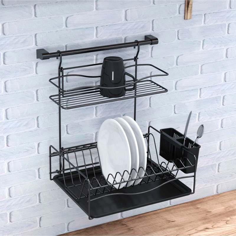 Escurridor de platos KB013 de alta capacidad con dos niveles, incluye tubo y kit de montaje para pared, soporte para cubiertos y bandeja inferor plástica Material: Metal y plástico Color: Negro Mate Alto: 47Cmts Ancho: 43Cmts Profundo: 32Cmts