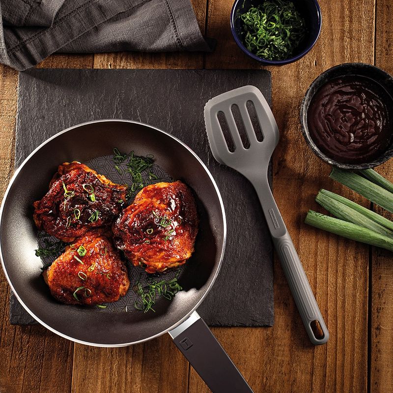 Espátula de silicona resistente a temperaturas de hasta 210 °C. Cuenta con un orificio en el mango para colgarla en la cocina. Ideal para usar en sartenes con revestimiento antiadherente y cerámico, ya que no daña el producto. Utensilio de silicona de alta calidad, ideal y seguro para uso alimentario, que cumple con las normativas ANVISA y FDA. Apto para lavavajillas, lo que facilita tu día a día.