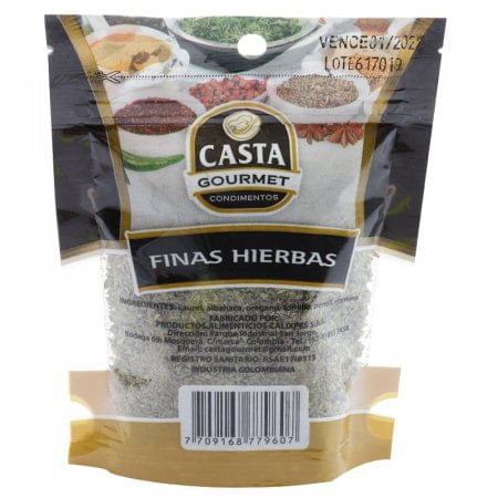 FINAS HIERBAS CASTA GOURMET 15 GRAMOS-Dorado Finas hierbas Casta Gourmet, ideal para adobar carne, pollo, cerdo o pescado, dale ese toque de chef a tus comidas. Laurel, albahaca, oregano, tomillo, perejil, romero. Registro Sanitario: RSAE1718315 Medidas en Centimetros: 13x3x10