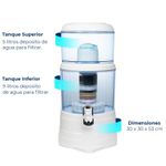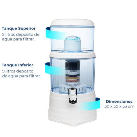 Filtro Purificador de Agua Bioenergético Ecotrade Filters - 14 Litros El Filtro Purificador de Agua Ecotrade es una solución avanzada para obtener agua alcalina, libre de contaminantes y enriquecida con minerales esenciales. Con su innovador sistema de filtrado, garantiza una pureza del 99.9% y mejora significativamente la calidad del agua que consumes, contribuyendo a tu salud y bienestar. Beneficios: Previene: Envejecimiento, enfermedades y problemas derivados de la hiperacidez, deshidratación y toxinas en el cuerpo. Elimina: Radicales libres, virus, bacterias, metales pesados, cloro y flúor en un 99.9%, mejorando la calidad del agua. Hidrata: Agua más liviana y eficiente en la hidratación celular, hasta 6 veces más que el agua convencional. Características Técnicas: Capacidad total: 14 litros (5L tanque superior y 9L tanque inferior). Materiales: Polipropileno libre de BPA para los tanques, ABS grado alimenticio en los accesorios. Dimensiones: 53 cm de altura, 30 x 30 cm de base. Sistema de Filtrado Avanzado: Cerámica Coreana: Filtra sedimentos y bacterias, con poros de 0.2 micras. Carbón Activado: Elimina compuestos orgánicos, olores, sabores, cloro y químicos. Esferas Mineralizadas: Balancea el pH y mejora la absorción celular de minerales esenciales. Arena Silica: Retira los ácidos del agua. Zeolita: Alcaliniza el agua y elimina metales pesados. Piedras Minerales Marinas: Aporta minerales esenciales como calcio, magnesio y potasio. Llave Magnética: Armoniza las moléculas del agua, mejorando su calidad y vitalidad. ¿Por qué elegir el Filtro Ecotrade? Disfruta de agua alcalina, libre de contaminantes, y con un sabor suave y agradable. Ideal para mejorar tu salud y bienestar, este filtro es perfecto para quienes buscan optimizar la calidad del agua en su hogar, tanto en aplicaciones residenciales como comerciales. Contenido del Producto: 1 Tapa superior plana 1 Tanque superior 1 Tanque inferior Filtro cerámico coreano Cilindro multicapas Disco de piedras minerales marinas 2 llaves magnéticas Accesorios en ABS y silicona Garantía de calidad: Contamos con repuestos disponibles para asegurar la durabilidad y funcionamiento óptimo del producto. ¡Disfruta de agua limpia, saludable y deliciosa todos los días!