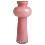 Florero en vidrio color rosa con acabado brillante y diseño estilizado tipo bloom, medidas 12x28x12 cm, ideal para destacar arreglos florales y aportar un toque moderno, delicado y sofisticado a salas, comedores o espacios decorativos.