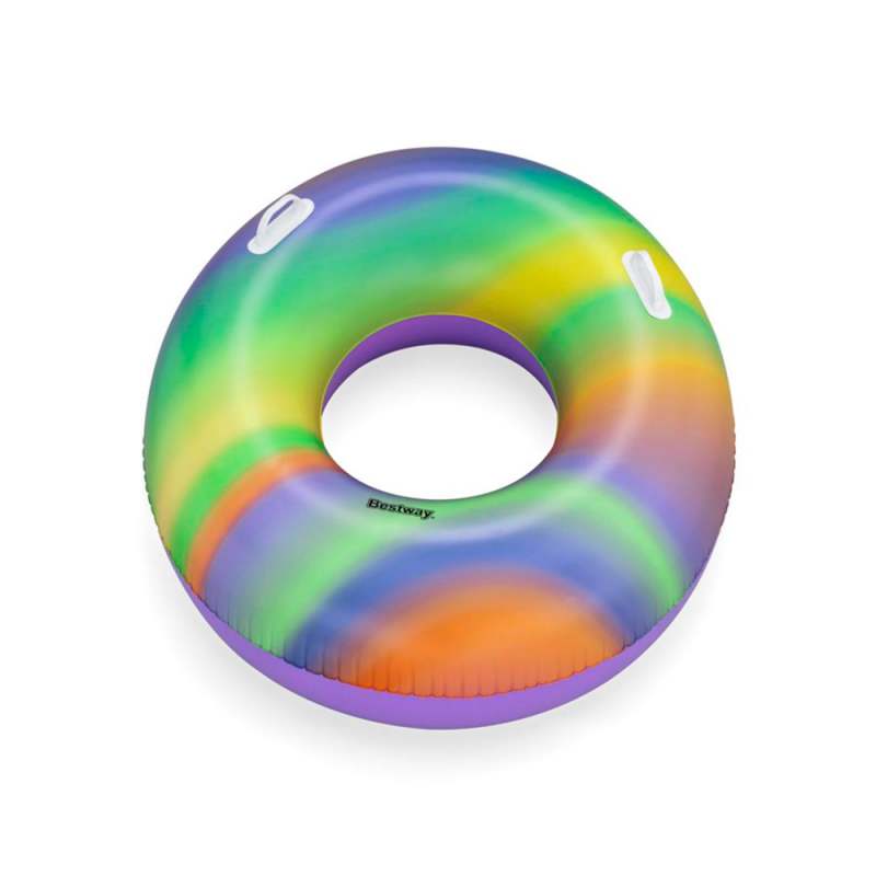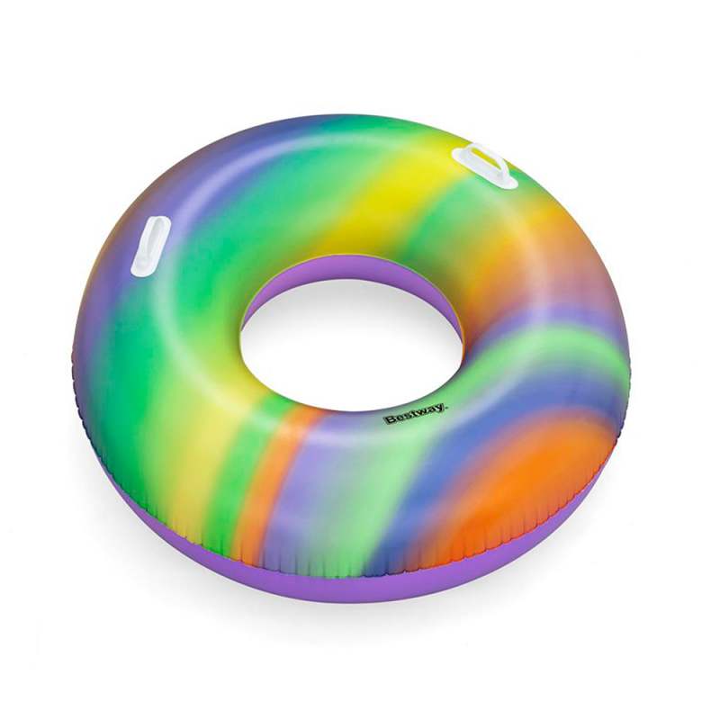 Tamaño: 1,05 m x 33 cm (41 pulg. x 13 pulg.) Perfecto para adultos y niños a partir de 12 años Estampado colorido de arcoíris Asas resistentes La película protectora Color Shield™ evita que la impresión en color se traspase a la piel cuando está mojada y conserva los colores brillantes Fácil de inflar, desinflar y almacenar Contenido: 1 flotador, 1 parche de reparación
